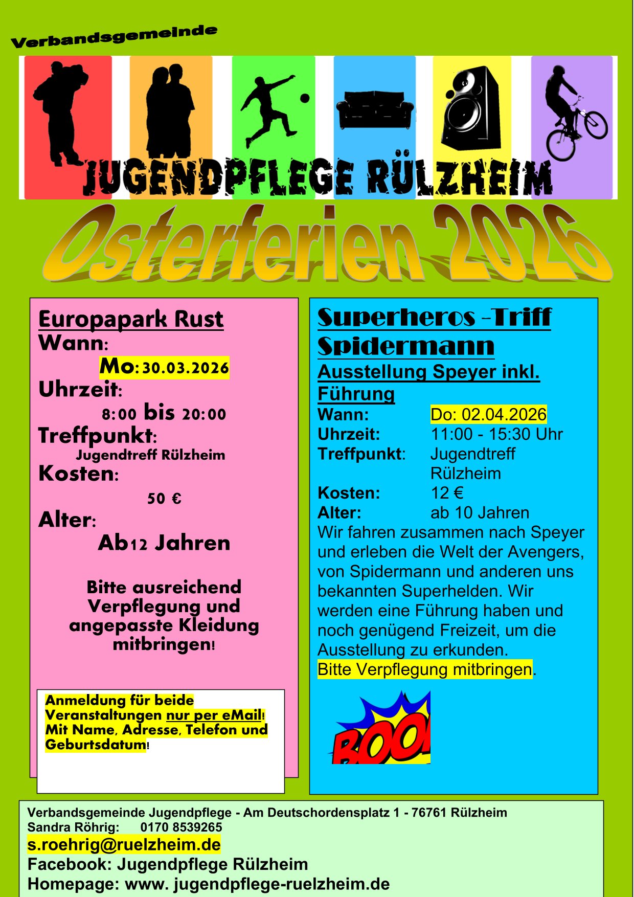 Osterferienprogramm # 2Osterferienprogramm #1Zwei tolle Ausflüge in den OsterferienKomm mit auf mein Schloss!Kids KinoMädchentreff im Juze RülzheimKids-Club 2026